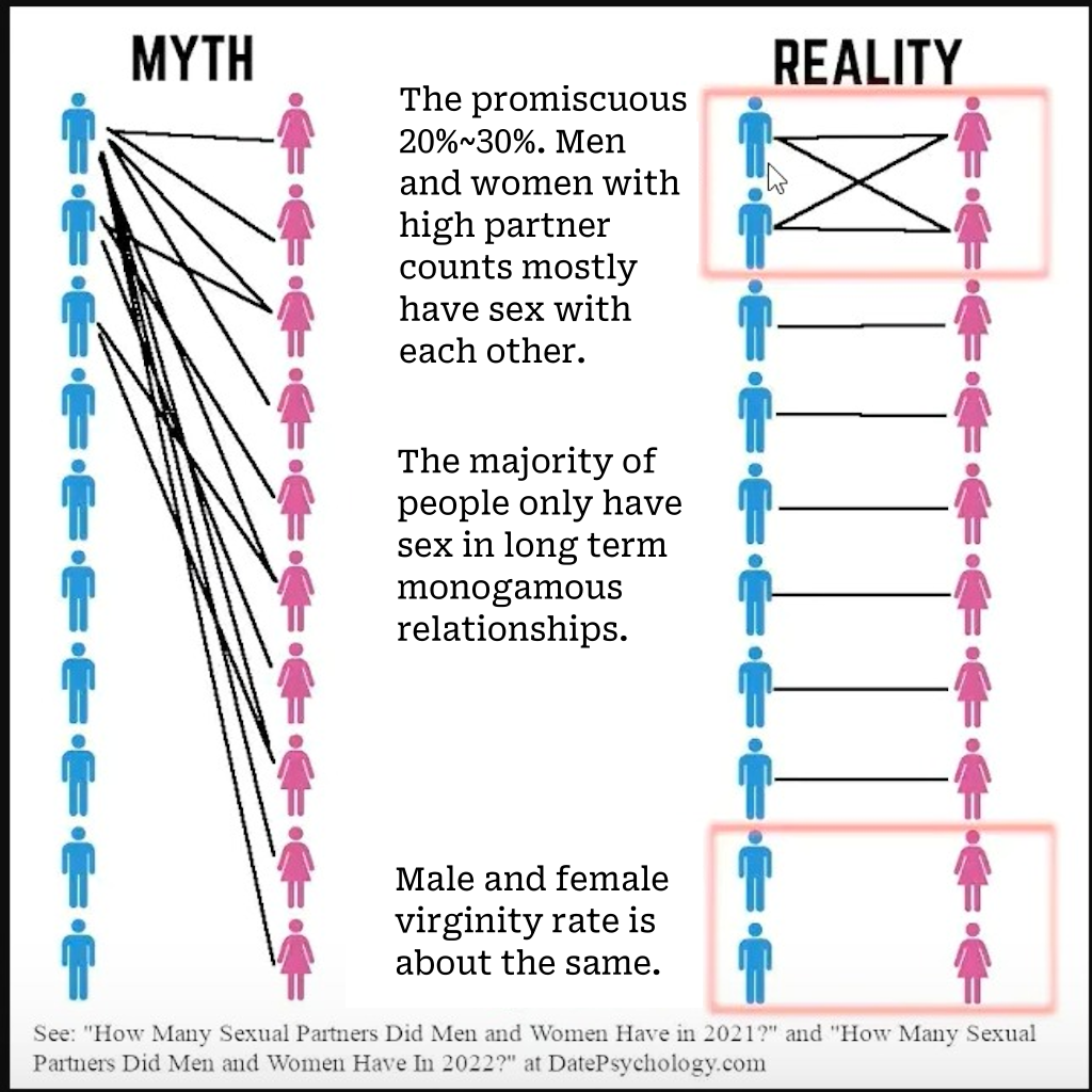 In reality, about 20%~30% of both men and women are promiscuous, about 50~60% of men and women only have sex in long term partnerships, and about 20% of both men and women are virgins.